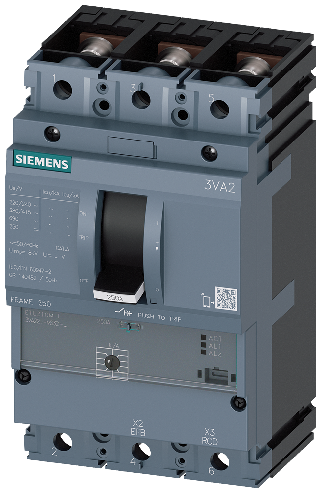 Interruptor automático 3VA2 IEC signada 25 A.630 A. 6. Modelos para montaje fijo, enchufable y extraíble. 7. La serie dispone de un disparador electrónico de sobreintensidad. 8. Con display integrado para la visualización de valores medidos. 9. Función de medida integrada y conexión opcional de comunicación a través de Modbus TCP, Modbus RTU, PROFINET y PROFIBUS. 10. Gama modular de accesorios internos con diversas funciones y fáciles de montar.