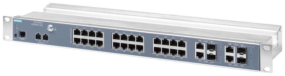 SCALANCE XR328-4C WG; managed IE Switch; rack de 19; 24 puertos eléctricos 10/100 Mbits/s; 4 puertos combinados 1000 Mbits/s eléctricos u ópticos; diagnóstico LED; pulsador RESET; puerto de consola; dispositivo PROFINET; función de gestión de redes; administrador de redundancia; alimentación 24 V DC; con certificación IEC 62443-4-2 web integrado y contacto de señalización para diagnóstico rápido y simple en el equipo e integración en sistemas de gestión de redes a través de acceso SNMP estandarizado. 24 puertos RJ45 y 4 puertos combinados (RJ45 o LC-FO).Switch to the future: SCALANCE X.