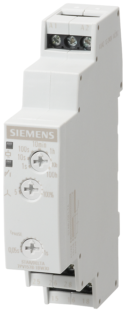 relé temporizador, electrónico con función estrella-triángulo 2 NA 7 rangos de tiempo 0,05 s … 100 h AC/DC 12-240 V borne de tornillo relé de tiempo SIRIUS 7PV15, Función estrella-triángulo, para el arranque selectivo de motores en conexión en estrella/triángulo. Se puede utilizar en armario eléctrico o cajas de distribución.Amplio campo de aplicación con una gran variedad de funciones en un espacio muy reducido. Utilizable en todo el mundo gracias a las homologaciones internacionales y a su amplio rango de tensiones.Los relés temporizadores 7PV están disponibles con una o múltiples funciones. Alternativamente, se ofrecen los relés temporizadores 3RP en diseño industrial con una o múltiples funciones y salida a semiconductor, o como relé electromecánico con apertura positiva o sin ella, y en cada caso con distintos sistemas de conexión.Relés SIRIUS – una gama para cada caso.